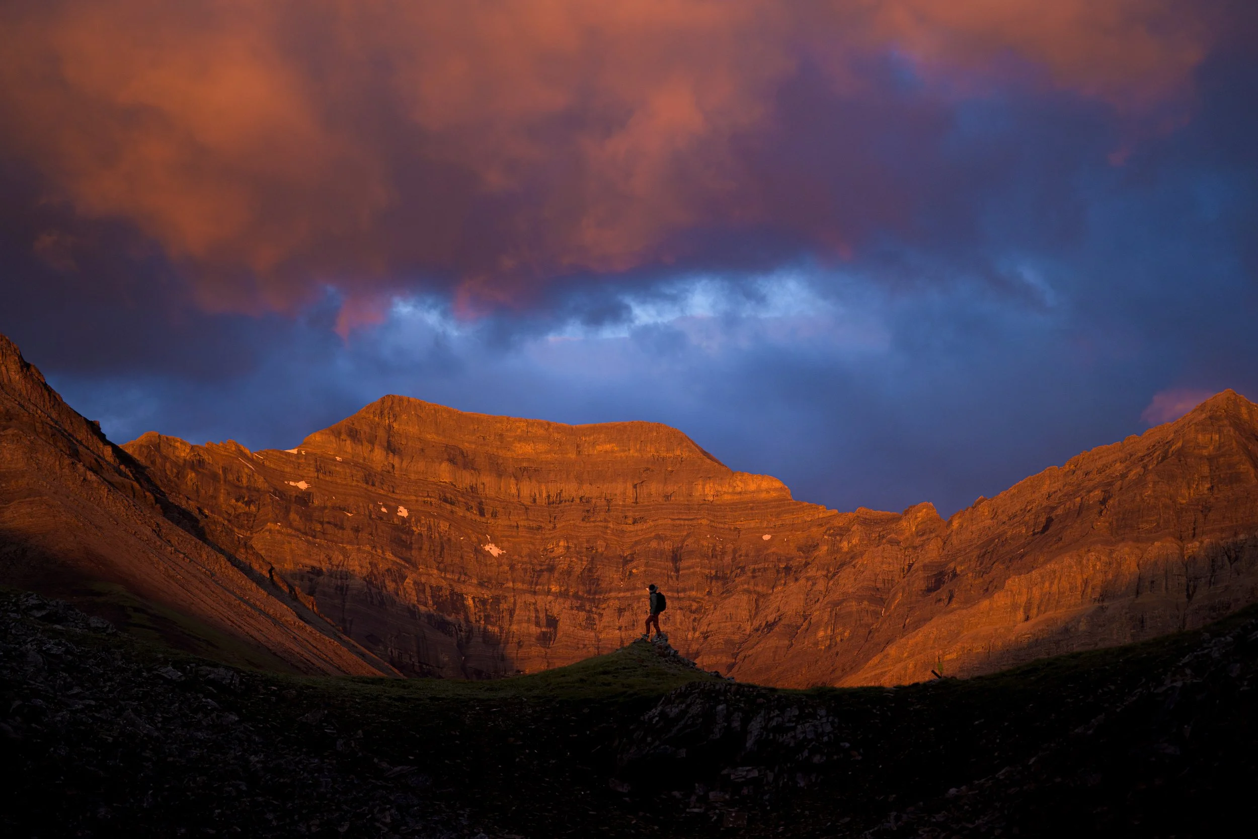 On day four- our final sunrise at camp, I poked my head outside our tent and noticed that the clouds were a stunningly vibrant shade of pink. We quickly geared up and I grabbed my camera to capture the colours and morning light on the surrounding mountains. Before I knew it, Kole was already sprinting up to this rocky outcrop framed by the peaks beyond.